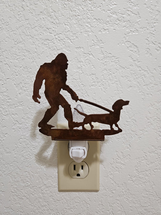 Bigfoot walking a Dachshund as a Night Light- made from smooth, durable rustic metal